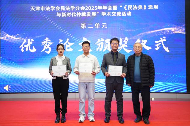 第二单元优秀论文颁奖仪式由民法学分会副会长、天津科技大学qm球盟会教授王吉林主持。天津市法学会民法学分会副会长、qm球盟会教授王春梅介绍了论文评选情况,天津市法学会联络部主任刘翠山、天津仲裁委员会副主任唐瑜、天津市法学会民法学分会名誉会长贾邦俊等与会嘉宾为获奖论文作者代表颁奖。